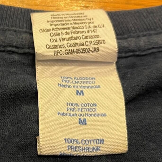 ■カラー:ネイビー ■サイズ:表示 M(肩幅44cm、身幅50cm、着丈61cm、袖丈19cm)多少の誤差はご了承ください。 ■素材:コットン100% ■原産国:Honduras ■コンディション:胸ブリント下付近に画像のような汚れ箇所がありますが、他は古着並で大きな汚れやダメージはありません。