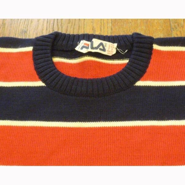 80年代製です! MADE IN ITALY フィラのボーダーニット ■カラー:ネイビー、白、赤のボーダー ■サイズ:表示 U.S.A 34(肩幅48cm、身幅45cm、着丈63cm、袖丈51cm)多少の誤差はご了承ください。 ■素材:PURE WOOL ■原産国:ITALY ■コンディション:古着並で目に付く汚れやダメージはありません。