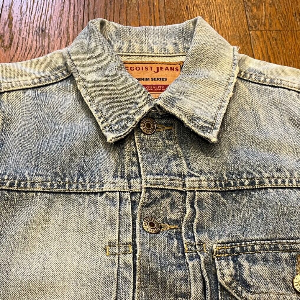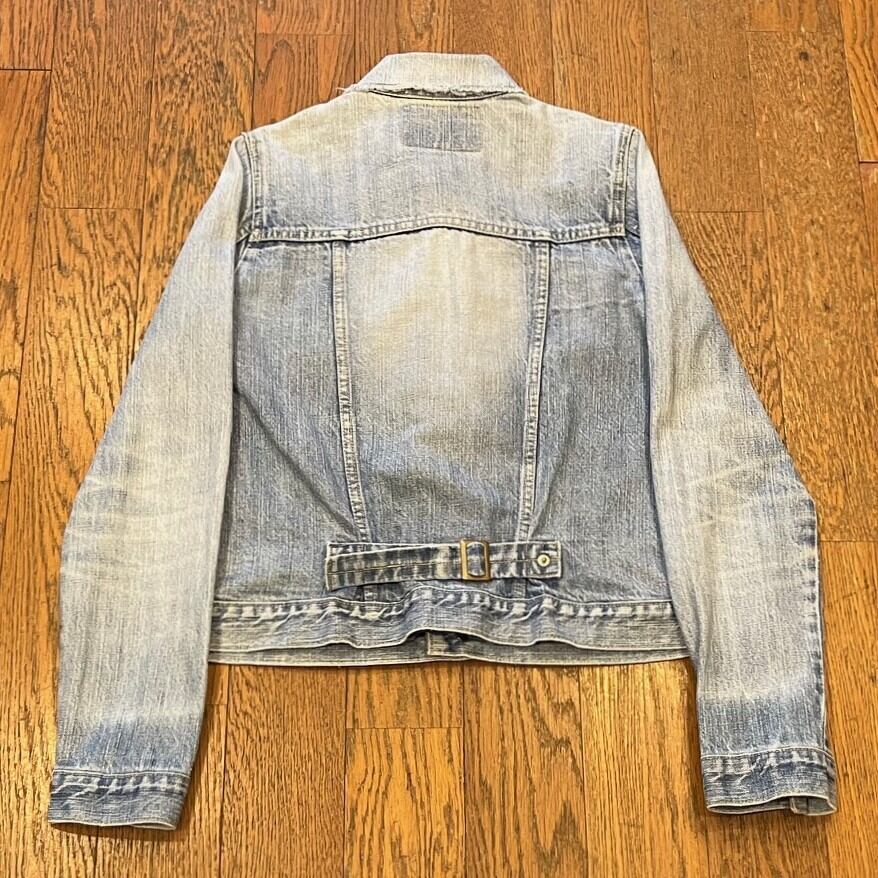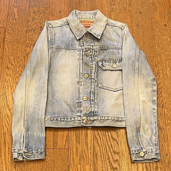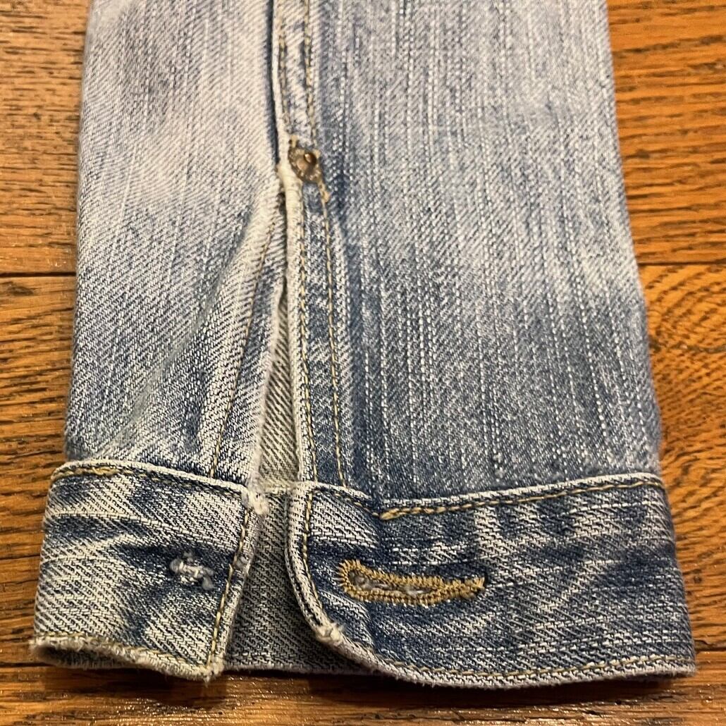■カラー:薄いブルー ■サイズ:表示 S(肩幅35cm、身幅41cm、着丈50cm、袖丈61cm)多少の誤差はご了承ください。 ■素材:コットン ■原産国:国内ブランド ■コンディション:右手袖ボタンがとれており左肘付近に画像のようなダメージがありますが、他は古着並で大きな汚れやダメージはありません。