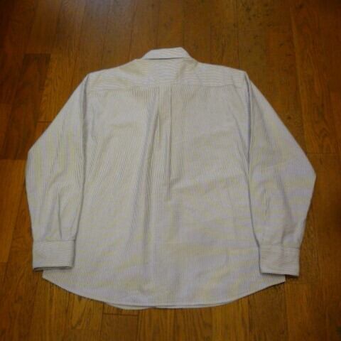 爽やか系です。 ■カラー:ブルー、白の細かいストライプ ■サイズ:表示 L (肩幅50cm、身幅57cm、着丈74cm、袖丈62cm、首周り45cm)多少の誤差はご了承ください。 ■素材:表記を確認できませんがコットンだと思われます。 ■原産国:確認できません。 ■コンディション:右肩ステッチ付近に画像のような細かい汚れがありますが、他は古着並で目に付く汚れやダメージはありません。
