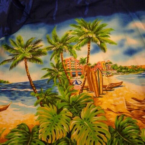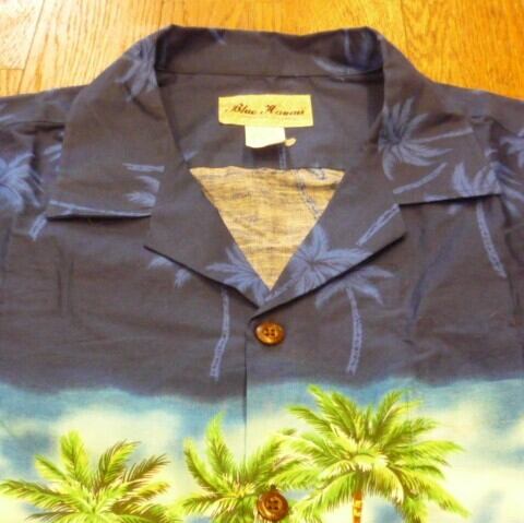 ■カラー:ネイビー地にヤシの木他柄 ■サイズ:表示 L (肩幅50cm、身幅63cm、着丈77cm、袖丈28cm)多少の誤差はご了承ください。 ■素材:コットン100% ■原産国:HAWAII ■コンディション:古着並で目に付く汚れやダメージはありません。