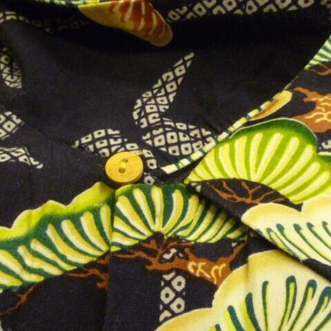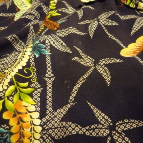 ■カラー:ネイビー地に柄 ■サイズ:表示 確認できません。 (肩幅42cm、身幅48cm、着丈68cm、袖丈21.5cm、首周り41cm)多少の誤差はご了承ください。 ■素材:表記はありませんがレーヨンだと思われます。 ■原産国:CHINA (株)アウトバーン ■コンディション:胸と袖部分に画像のような細かいキズがありますが、他は古着並で大きな汚れやダメージはありません。