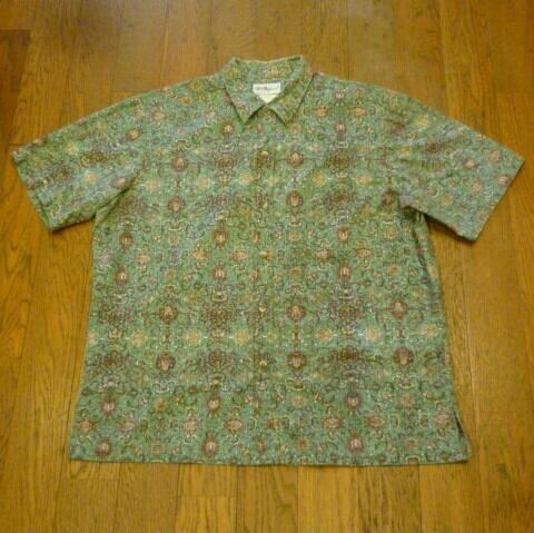 ■カラー:裏地使いのグリーン地に柄 ■サイズ:表示 L (肩幅49cm、身幅60cm、着丈72cm、袖丈26cm、首周り42cm)多少の誤差はご了承ください。 ■素材:コットン80% ポリエステル20% ■原産国:HAWAII U.S.A ■コンディション:襟部分が画像のように擦り切れていますが、他は古着並で大きな汚れやダメージはありません。