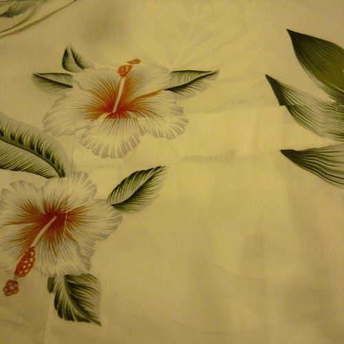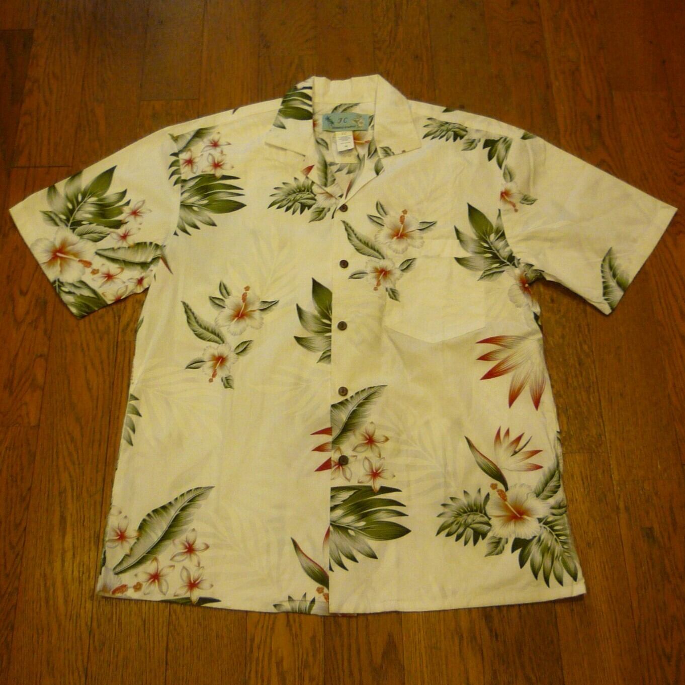 ■カラー:白地にハイビスカス他柄 ■サイズ:表示 M (肩幅52cm、身幅57cm、着丈73cm、袖丈26cm)多少の誤差はご了承ください。 ■素材:コットン100% ■原産国:DESIGNED IN HAWAII ■コンディション:古着並で目に付く汚れやダメージはありません。