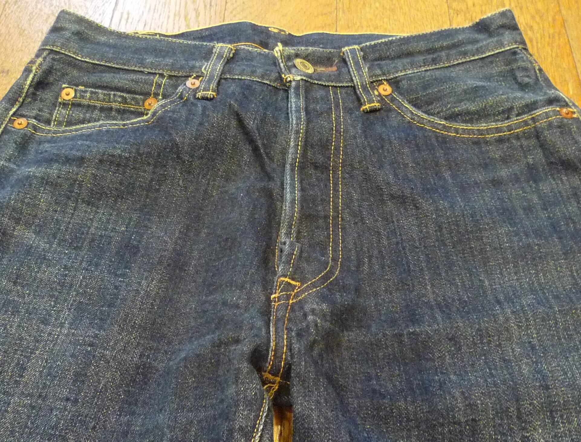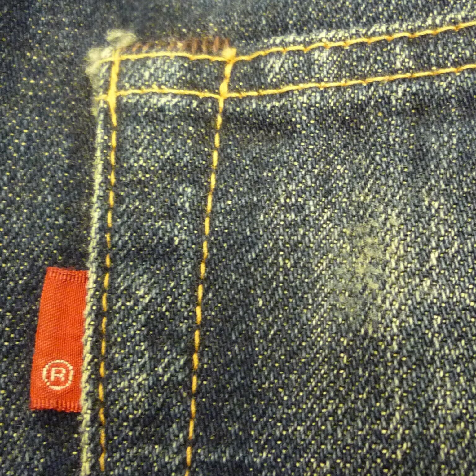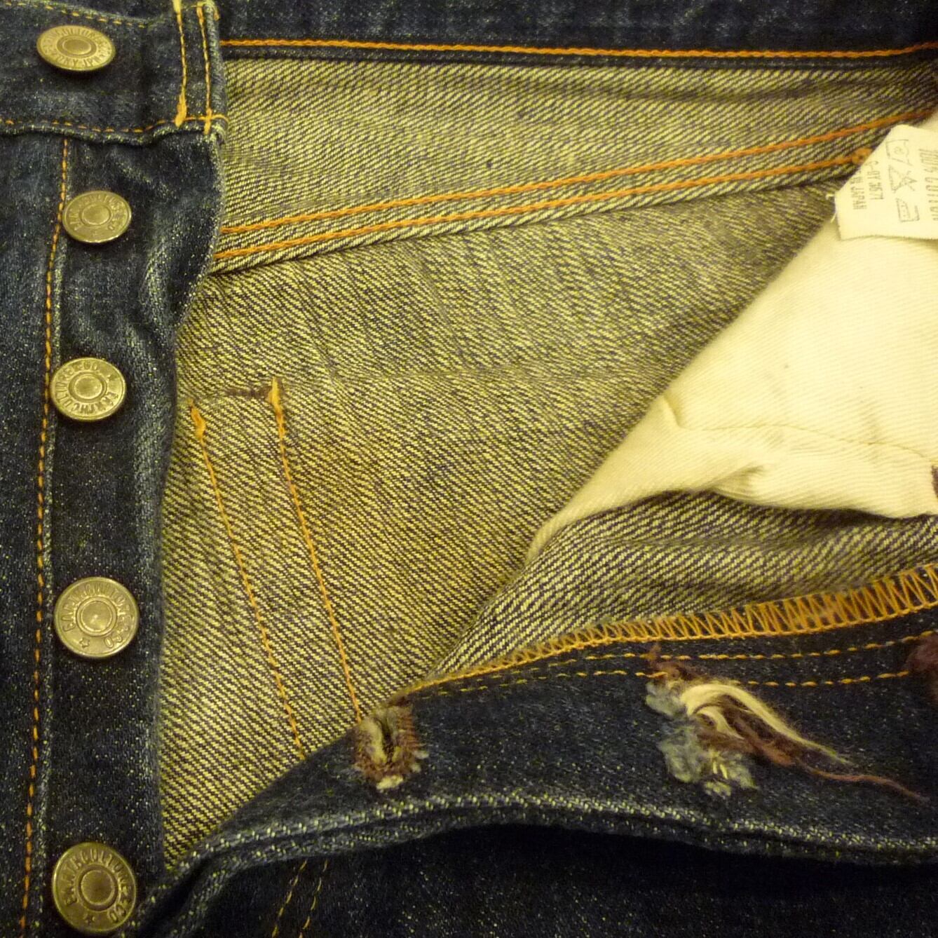 ■カラー:インディゴ ■サイズ:表示 W29.L34(実寸ウエスト72cm、股下88cm、股上28cm、股幅29cm、裾幅21cm)多少の誤差はご了承ください。 ■素材:コットン100% ■原産国:JAPAN ■コンディション:画像のようにトップボタンから3番目のボタンホールがほつれており両かかと部分が多少擦り切れていますが、他は古着並で目に付く汚れやダメージはありません。