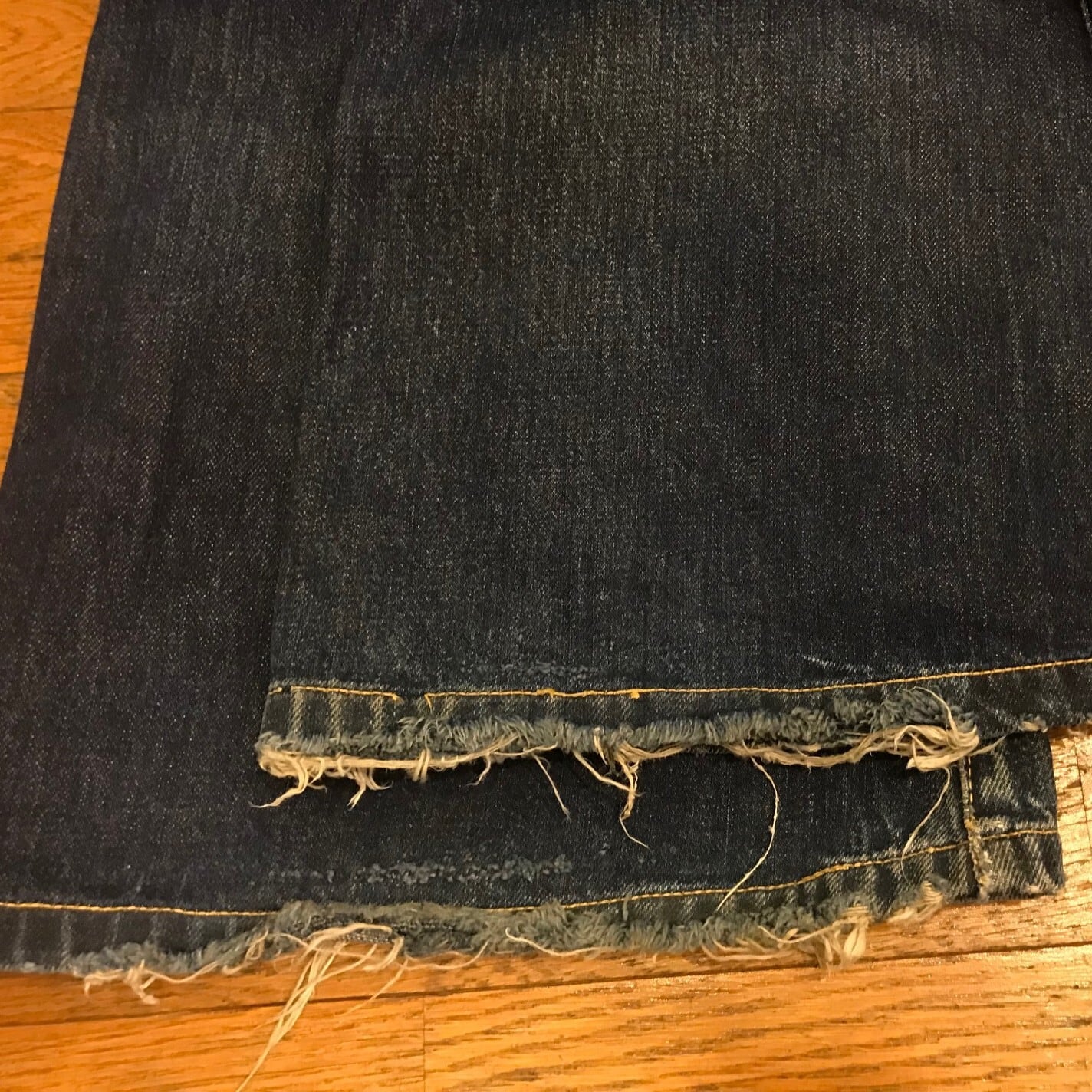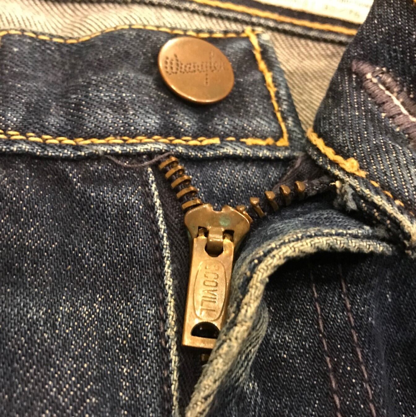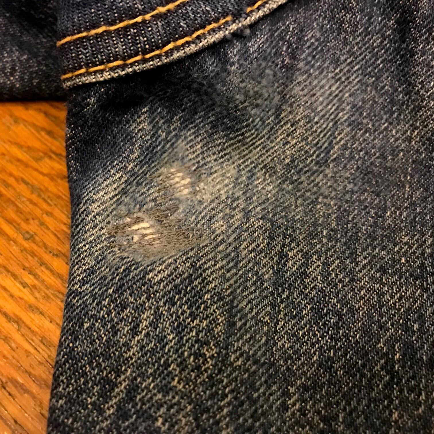 ■コンディション:1.後部両ポケット、他糸切れ箇所があります。 2.裾部分が画像のように擦り切れています。 3.股部分に画像のようなリペア箇所があります。