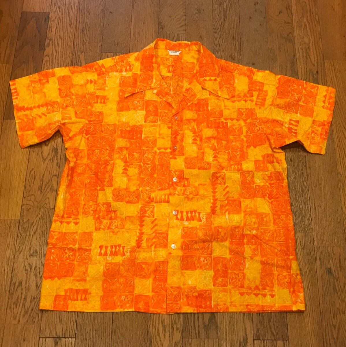 ロングポイント、襟芯入りです ! ■カラー:オレンジ系柄 ■サイズ:表示 2XL(肩幅53cm、身幅68cm、着丈81cm、袖丈27cm)多少の誤差はご了承ください。 ■素材:コットン100% ■原産国:HAWAII ■コンディション:古着並で目に付く汚れやダメージはありません。