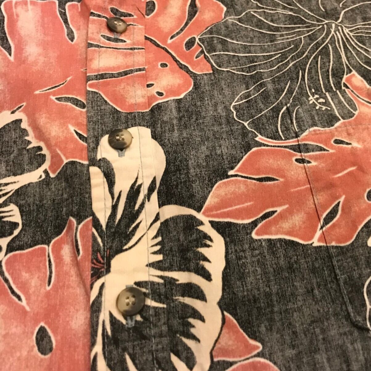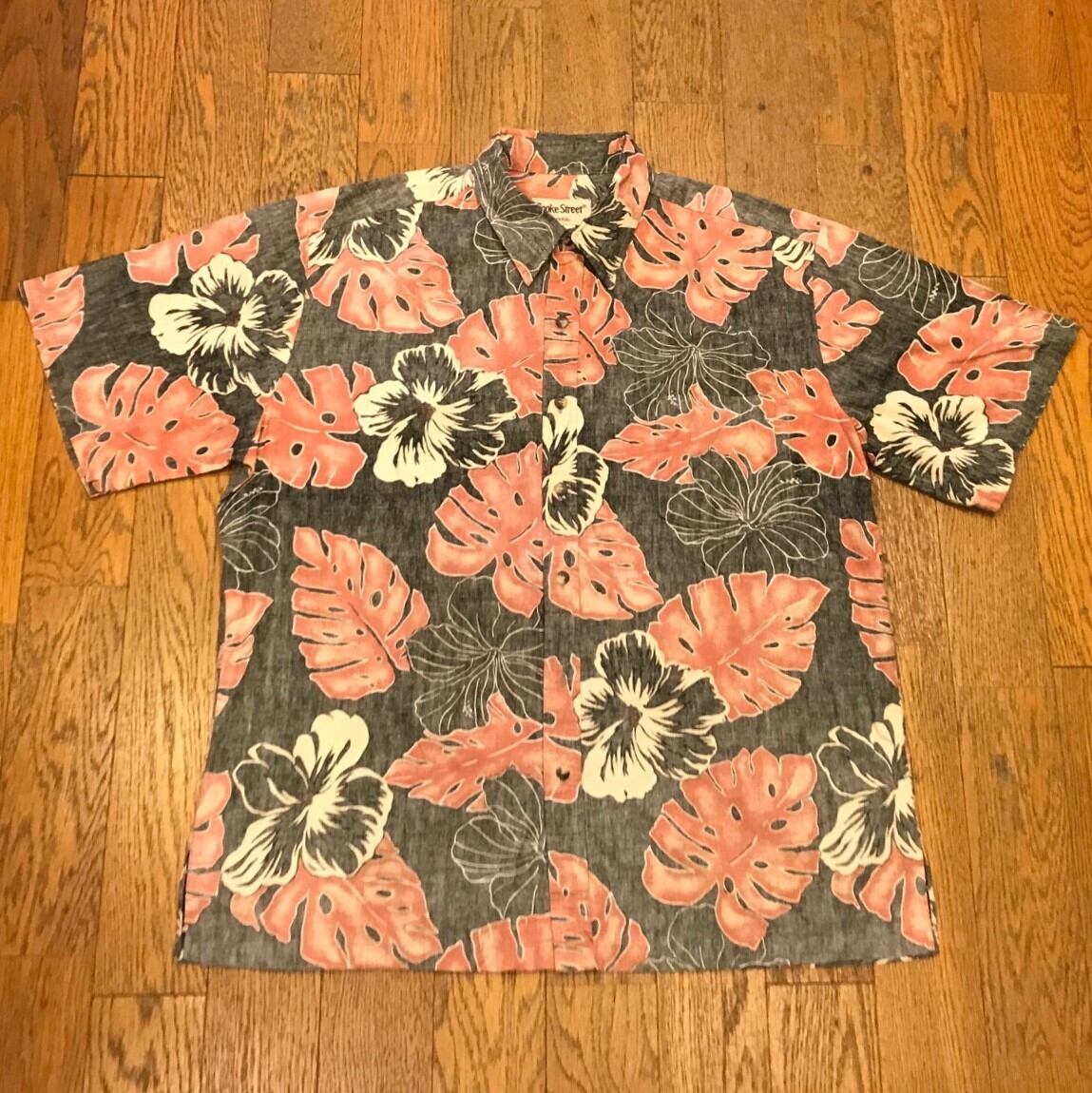 ■カラー:裏地使いの黒地に柄 ■サイズ:表示 L(肩幅51cm、身幅63cm、着丈75cm、袖丈26cm、首周り42cm)多少の誤差はご了承ください。 ■素材:コットン100% ■原産国:HAWAII U.S.A ■コンディション:古着並で目に付く汚れやダメージはありません。
