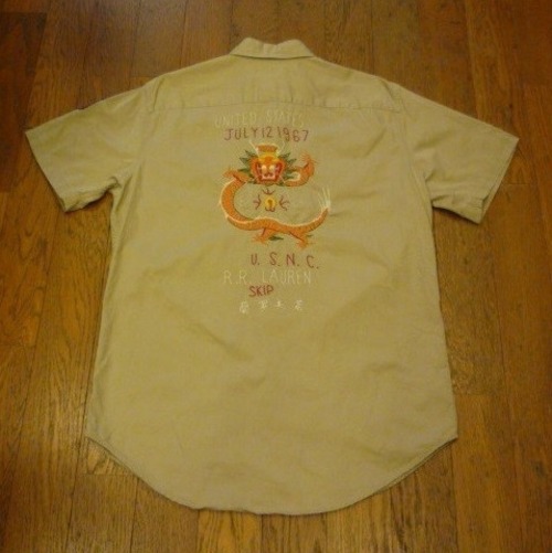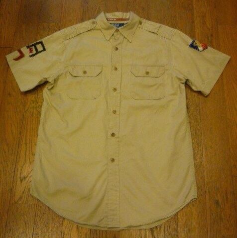 希少です!!ラルフローレンのミリタリー風シャツ ■カラー:ベージュ (背中に刺繍入り) ■サイズ:表示 M (肩幅46cm、身幅55cm、着丈77cm、袖丈23cm、首周り40cm)多少の誤差はご了承ください。 ■素材:コットン100% ■原産国:PHILPPINES ■コンディション:古着並で目に付く汚れやダメージはありません。